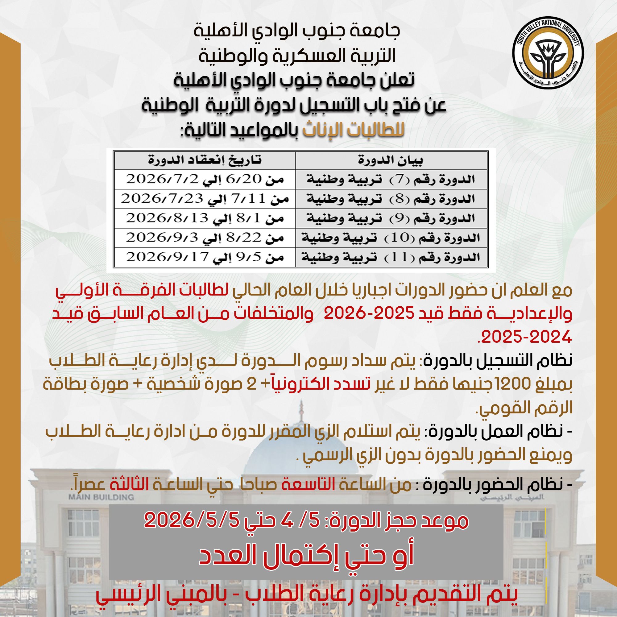 تعلن جامعة جنوب الوادي الأهلية عن فتح باب التسجيل في دورة التربية العسكرية للطلاب... عرض |